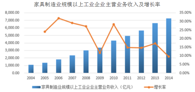 近年來,受全球經(jīng)濟增長放緩、人力成本上升等多方面因素的影響,我國家具業(yè)發(fā)展速度有所降低,2014 年家具制造業(yè)規(guī)模以上企業(yè)主營業(yè)務(wù)收入同比增長降至 9.5%,較往年平均水平有所下降,但綜合而言,我國家具業(yè)仍處于成長期階段,未來市場規(guī)模仍會持續(xù)擴大。