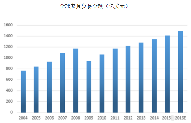 根據(jù)米蘭工業(yè)研究中心 (The Centre for Industry Studies, 以下簡稱“CSIL”)的統(tǒng)計,世界家具貿(mào)易總額規(guī)模從 2005 年的 850 億美元增長至 2014 年的 1,340億美元,據(jù)其預(yù)測,2015 年世界家具貿(mào)易總額將增至 1,410 億美元,2016 年會沿襲增長趨勢,達(dá)到 1,490億美元。從 2005 年至 2016 年世界家具貿(mào)易總額的變動趨勢來看,雖然 2008 年的全球金融危機對全球家具生產(chǎn)和貿(mào)易造成一定的沖擊,但隨著全球經(jīng)濟的逐步復(fù)蘇,發(fā)達(dá)國家的消費能力逐步恢復(fù)并增長,2011年全球家具貿(mào)易金額基本恢復(fù)到金融危機之前的水平,同時,新興國家和地區(qū)的消費能力逐步增強,全球家具貿(mào)易金額呈現(xiàn)增長趨勢。
