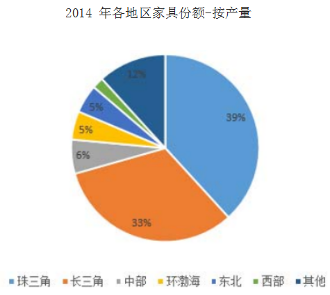 與此同時,目前我國家具業(yè)發(fā)展呈現(xiàn)明顯的產(chǎn)業(yè)集群效應(yīng)。2014 年我國各地區(qū)家具份額(按收入)占比前四名分別為“珠三角”、“長三角”、環(huán)渤海三角洲家具工業(yè)區(qū)與中部家具工業(yè)區(qū)。 其中“珠三角”和“長三角”擁有豐富的勞動力資源以及技術(shù)資源,相較其他地區(qū)有較為明顯的優(yōu)勢,歷來是我國家具業(yè)發(fā)展重地。2014 年,這兩個地區(qū)的家具產(chǎn)量合計占全國總量的 72%。