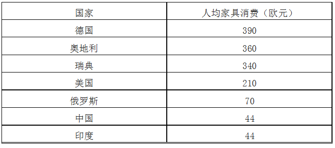 根據(jù)德國家具工業(yè)協(xié)會數(shù)據(jù),歐洲總體家具支出高于其他地區(qū),其中,2013年德國人均家具消費全球最高,達(dá)到 390 歐元。美國作為世界家具消費大國,人均家具支出為 210 歐元,而中國人均家具消費遠(yuǎn)低于國際平均水平,大約在 44歐元。美國、中國等國家人均家居消費與歐洲的差距預(yù)示著巨大的家具消費提升空間。